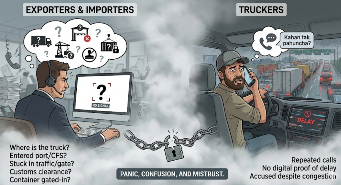Once a truck starts moving, everyone goes blind. What exporters & importers don’t know Where exactly is the truck? Has it entered the port or CFS? Is it stuck in traffic or waiting at a gate? Has customs clearance started? Is the container gated-in or still outside? What truckers face Repeated calls: “Kahan tak pahuncha?” No digital proof of delay cause Accused even when delay is due to port congestion This lack of visibility creates panic, confusion, and mistrust.