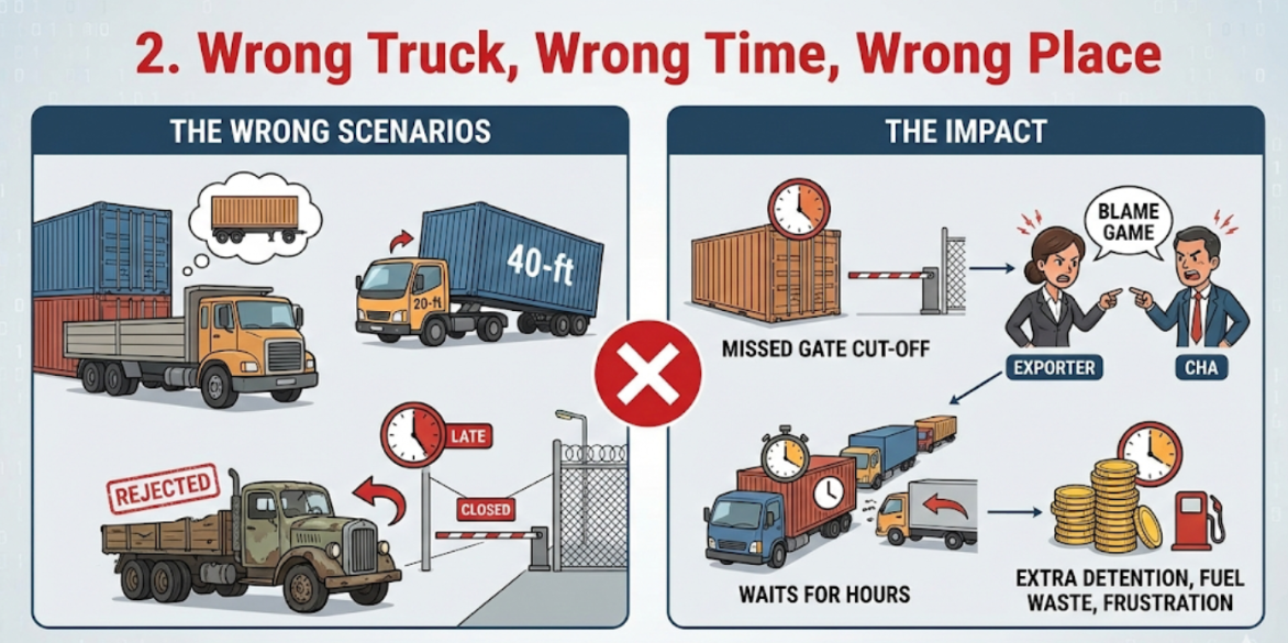 One of the most common pain points: The truck that arrives is not the truck that was promised. Examples Open truck arrives instead of container trailer 20-ft compatible truck sent for 40-ft container Old or unfit vehicle rejected at gate Truck arrives too early or too late Impact Cargo misses gate cut-off CHA and exporter start blaming each other Truck waits for hours or gets turned back Extra detention, fuel waste, and frustration No one takes accountability—because nothing was formally tracked.