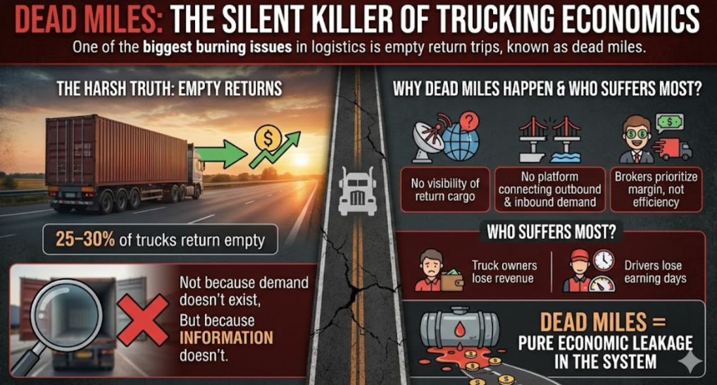 One of the biggest burning issues in logistics is empty return trips, known as dead miles. The harsh truth 25–30% of trucks return empty Not because demand doesn’t exist But because information doesn’t Why dead miles happen No visibility of return cargo No platform connecting outbound & inbound demand Brokers prioritize margin, not efficiency Who suffers most? Truck owners lose revenue Drivers lose earning days Fuel, tolls, and maintenance still apply Dead miles are pure economic leakage in the system.