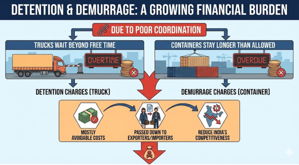 Due to poor coordination: Containers stay longer than allowed Trucks wait beyond free time Result Detention charges (truck) Demurrage charges (container) These costs: Are mostly avoidable Get passed down to exporters/importers Reduce India’s competitiveness