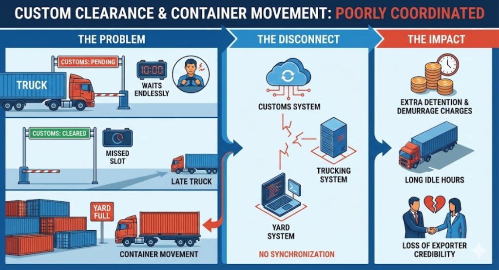 Customs clearance, container movement, and truck arrival are not synchronized. What goes wrong Truck arrives before customs clearance → waits endlessly Customs cleared but truck arrives late → missed slot Container movement not aligned with yard availability Impact Long idle hours Extra detention & demurrage charges Loss of exporter credibility with buyers All because systems don’t talk to each other.