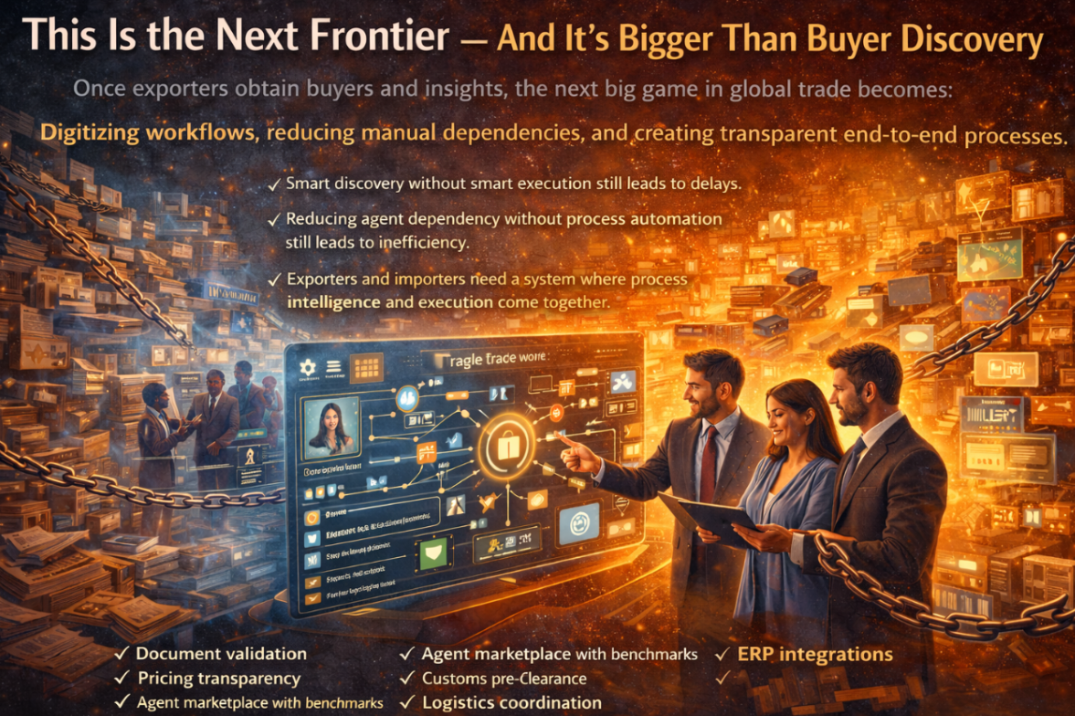 These are not occasional pain points — these are structural inefficiencies that reduce India’s competitive edge in global trade. The next transformation — after buyer and data discovery — must be about: Digitizing execution, automating workflows, removing opacity, and leveling the operational playing field. When this is solved, exporting will become not just possible — but efficient, competitive, and scalable for businesses of all sizes.