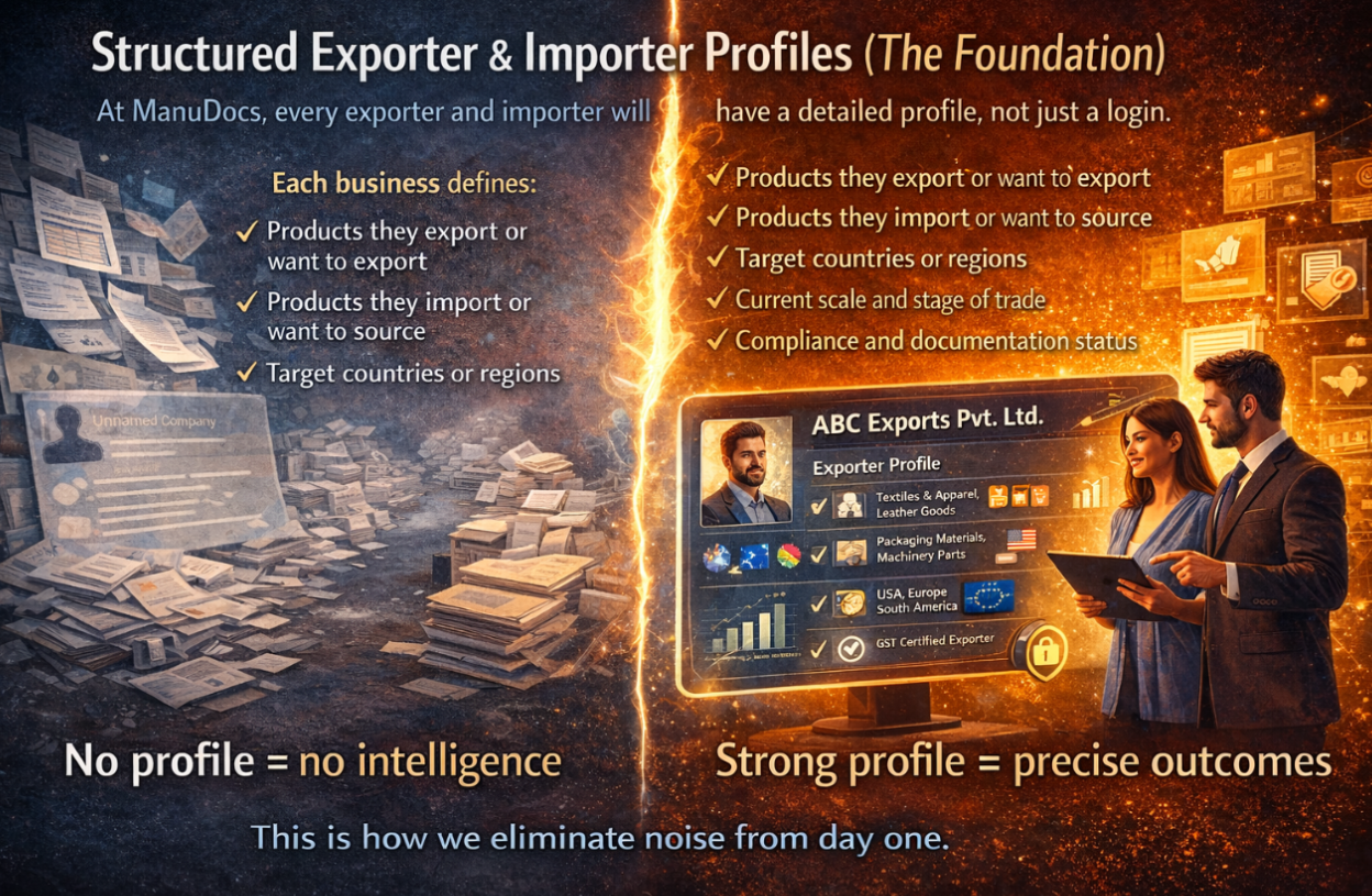 Yet the core problem remains untouched: Indian exporters still don’t get buyers. Indian importers still don’t get reliable suppliers. Why? Because what MSMEs receive today is information, not intelligence. At ManuDocs, we are not building another information platform. We are building hyper-personalized trade intelligence, backed by real data, mapped to each business’s exact reality.
