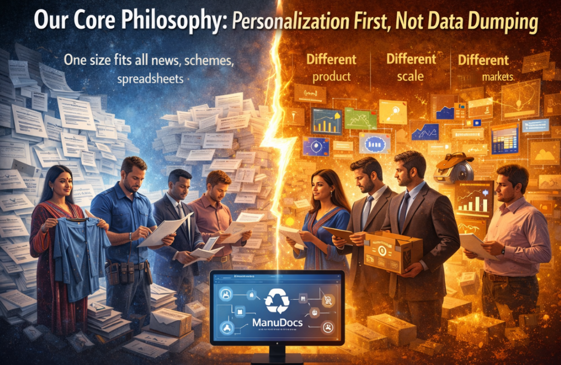 So why should everyone receive the same news, same schemes, same spreadsheets? ManuDocs starts with one foundational shift: Trade intelligence must be personalized at the business level — not generalized at the nation level.