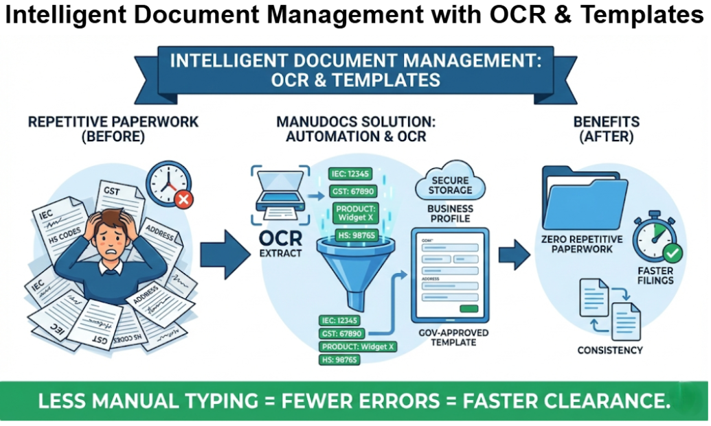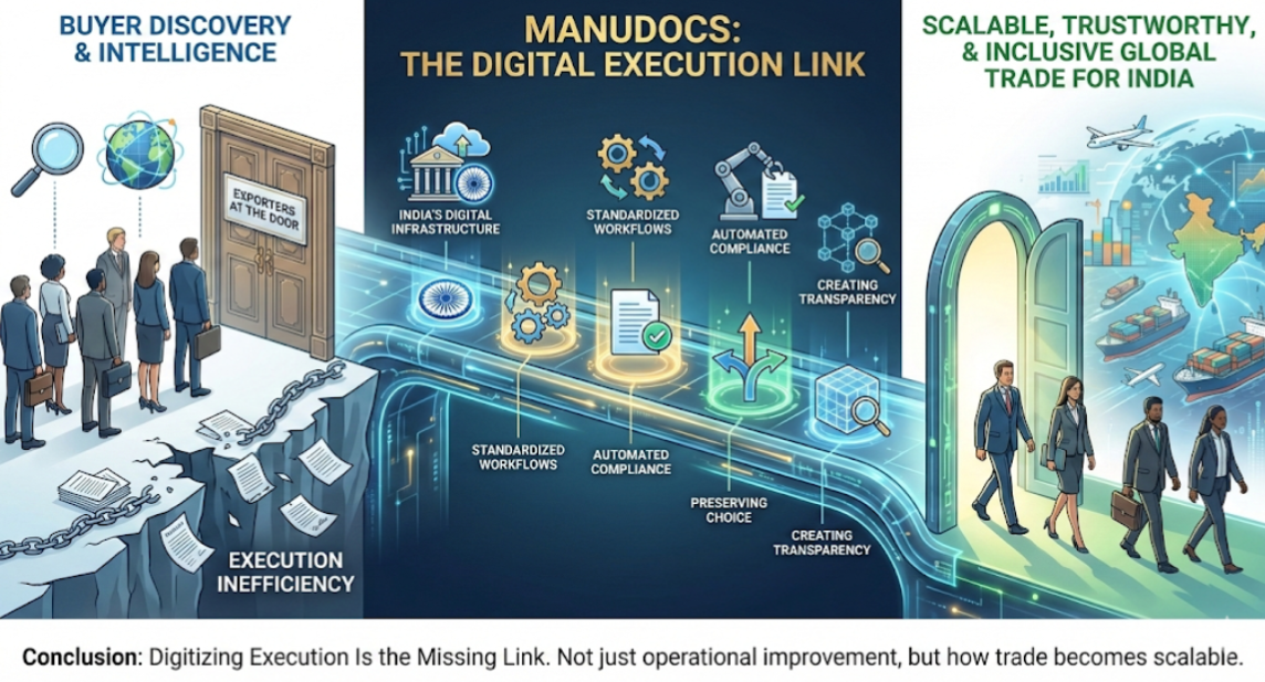 Buyer discovery and intelligence bring exporters to the door. Execution efficiency decides whether they walk through it. ManuDocs solves the execution problem by: Building on India’s official digital trade infrastructure