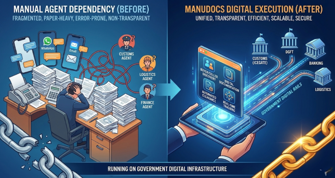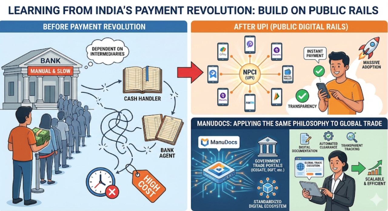 The key lesson: Don’t replace the ecosystem. Standardize and digitize it using public infrastructure. ManuDocs applies the same philosophy to global trade execution.