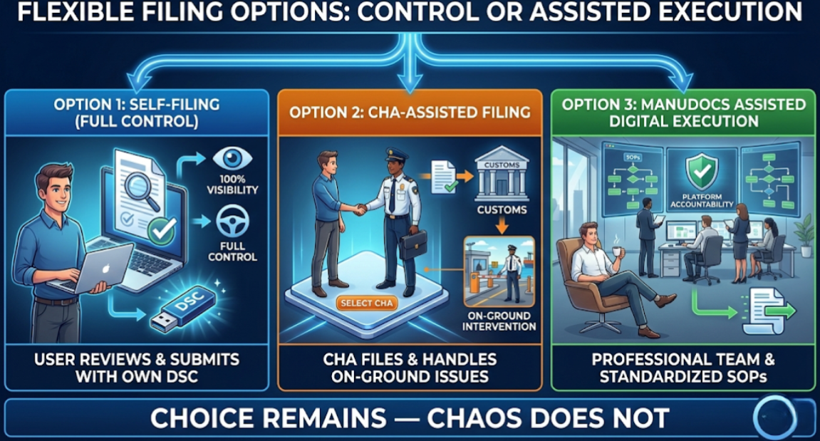 ManuDocs does not remove choice — it removes friction. Exporters and importers can choose: Option 1: Self-Filing (Full Control) Use their own DSC